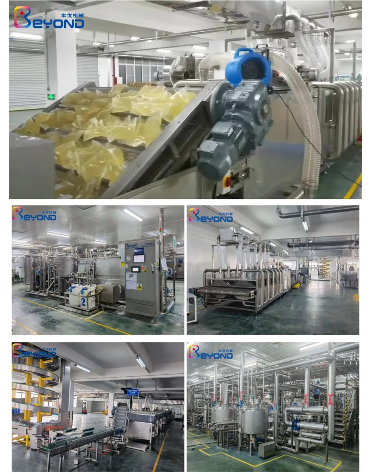 本优提供定制风味冻加工生产线,中性产品采用在线高温UHT杀菌;无菌罐装替代传统热灌装生产,可常温储存、运输;同时也避免了产品长时间高温导致的易变色变味、影响风味的问题。酸性产品采用通过式水浴冷却装置,该装置采用循环冷水及输送装置,加快了冷却速度,提高了生产效率。