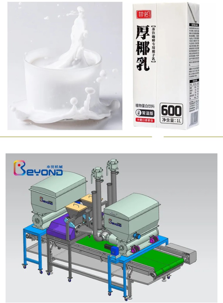 本优提供定制椰乳加工生产线,厚椰乳的主要原料是新鲜的椰子肉和椰子水混合榨汁,经过本优先进的椰子冷压榨取汁工艺、椰子水收集系统、巴氏杀菌系统、存储系统、高速乳化系统、调配系统、均质系统、三合一超高温无菌杀菌机(列管、injection、infusion与一体)、高压无菌均质、无菌罐系统低温处理制作而成。